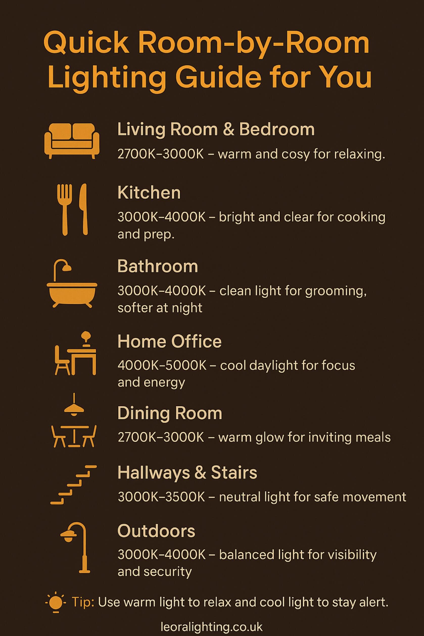 Choosing the right light colour temperature transforms how rooms look and feel. Use warm light (2700K-3000K) for relaxing spaces, such as bedrooms, and cooler light (4000K-5000K) for productive areas, like offices, to enhance mood and function.